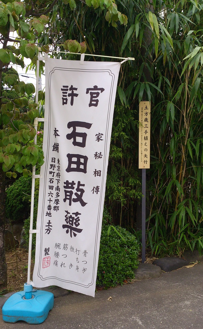 この木刀がある場所の直ぐ脇に、あの矢竹が植わっておりました。矢竹だけでは色々な所に載っているお写真と同じになってしまうので、薬屋の旗と共に……