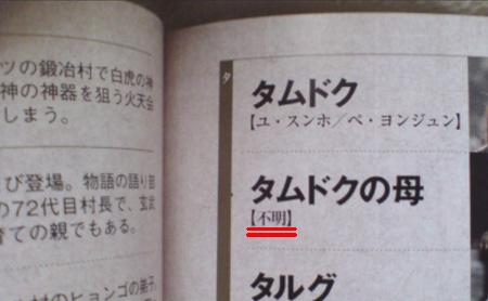この間、『太王四神記』のドラマガイドを購入したのだが、開いて吃驚したページ(↓画像参照)。“タムドクの母=不明”って…そんな事って有り得ない。関係者とか監督に訊いて来いよ、出演者の名前ぐらい。