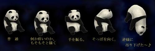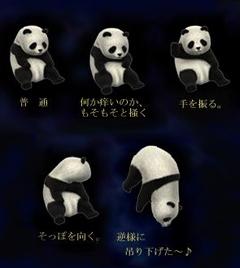 で、コレね、もそもそ動きが見られるんだ。微妙な間隔で動きも変化する。可愛いから行動パターンをお纏めしてみました。因みに、一番右のパンダは、マウスで持ち上げたところなんだが、 右手=マウス,左手=“Fn”キー,口に咥えたペン先=“Prt Scr”キー を駆使。そこまでしてコピる必要は全然無いと思うんだ。