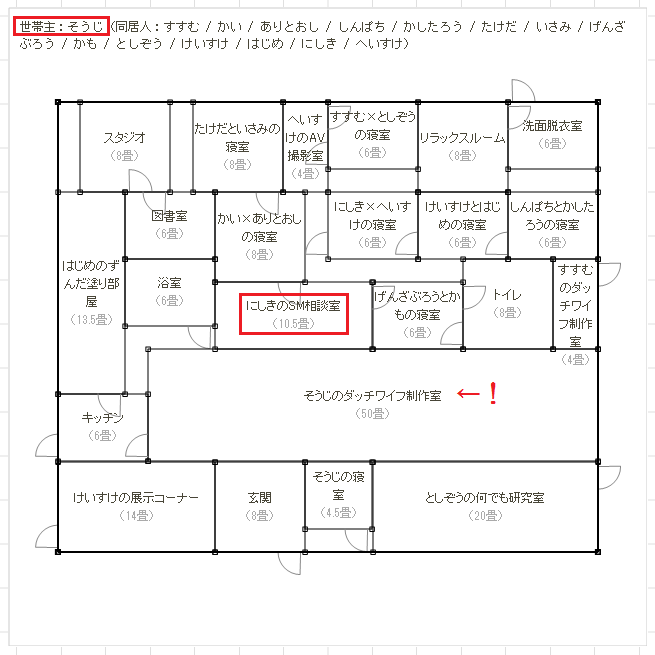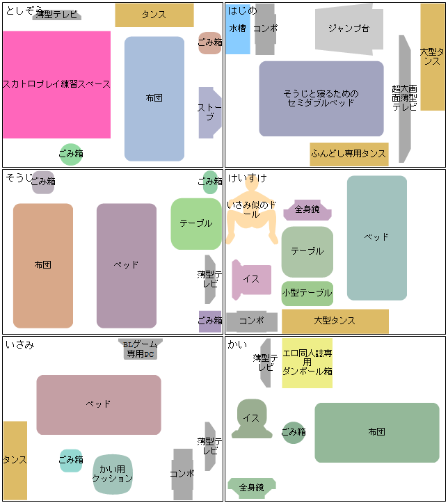 某お方から教えて貰ったGEN図NET(コピぺで宜しく→http://genzu.net/)の部屋ジェネレータで遊びました。(登場人物:近藤・土方・沖田・斎藤・山南・島田)